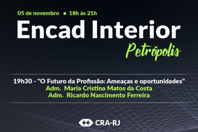 O CRA-RJ vai promover o 13º Encontro de Administradores de Petrópolis, no dia 05 de novembro, no Salão nobre da Universidade Católica de Petrópolis (Rua Benjamin Constant, 213 – Centro), das 18h às 21h. O evento vai contar com a presença do Adm. Leocir Dal Pai, presidente do CRA-RJ; e dos palestrantes Adm. Ricardo José da Silva Machado e Adm. Maria Cristina Matos da Costa, com a palestra “O Futuro da profissão: Ameaças e Oportunidades”.