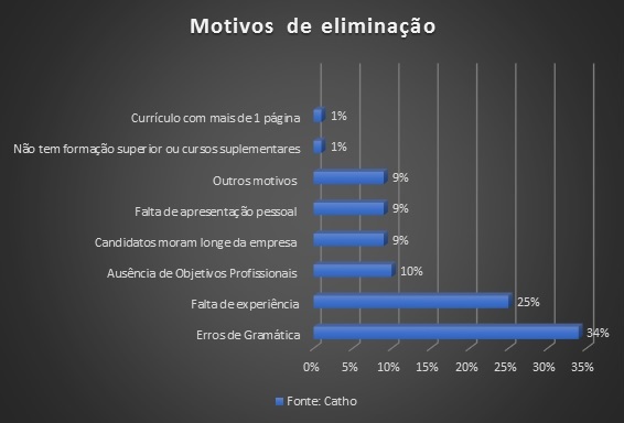 Catho, 34% dos recrutadores ouvidos afirmam que erros de gramática são o principal fator para eliminação de candidatos; seguido por falta de experiência (25%), ausência de objetivos profissionais (10%) e porque os candidatos moram longe da empresa (9%).